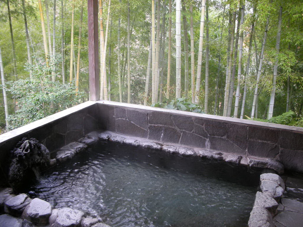 露天風呂は源泉かけ流し。大小3つの岩風呂をメインとし、ほかに壷湯と五右衛門風呂、お湯を浅く張った寝湯がある。上下2段になっている岩風呂は、上段の円形岩風呂からこぼれたお湯が下段の岩風呂へと流れ落ちる仕組み。そのためか上段のほうがちょっとだけ熱い。下段の岩風呂の中には石のベンチがあり、おのずとそこに腰かけて半身浴をすることになる。ベンチがなかったらもっと大勢が入浴できるはずだが。露天スペースの隅にも岩風呂があり、こちらは大人1人が足を伸ばしたら精一杯かも。こじんまりとしているが、ほかの湯船からは死角になっているので、意外とゆったり入浴できる。