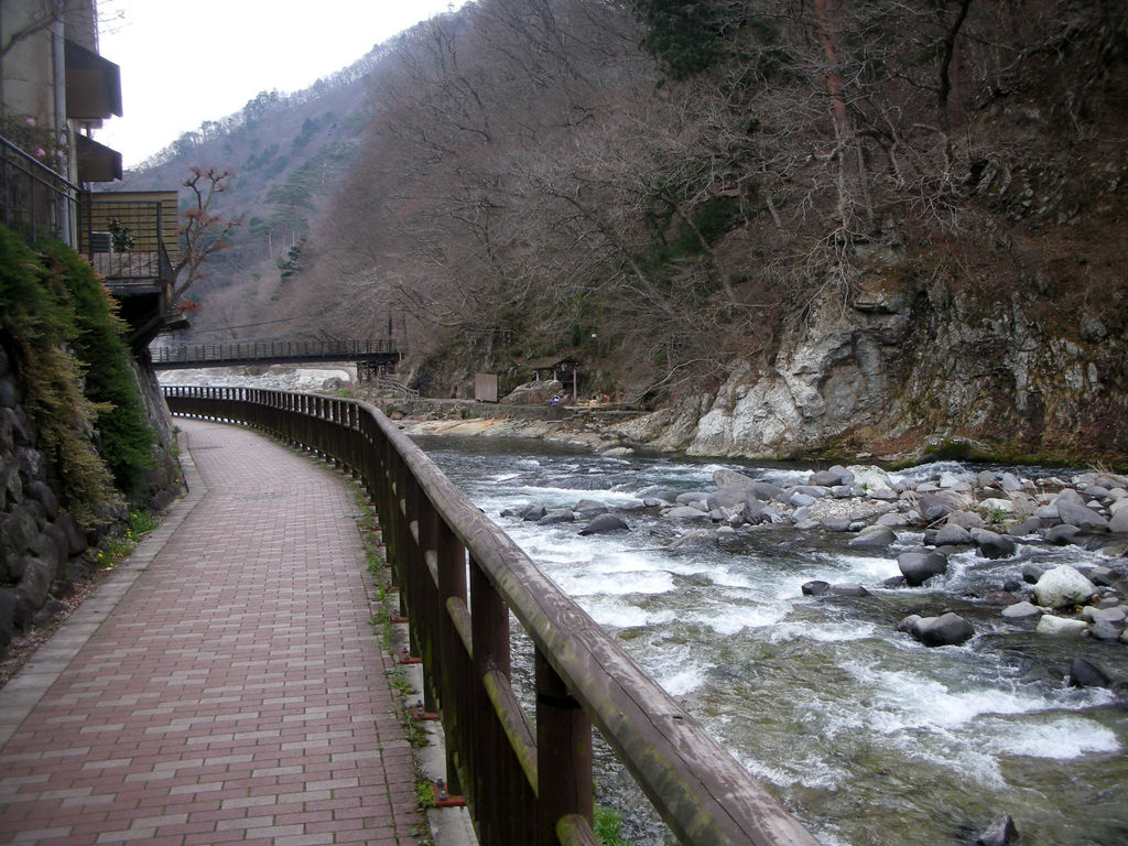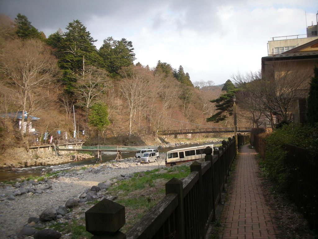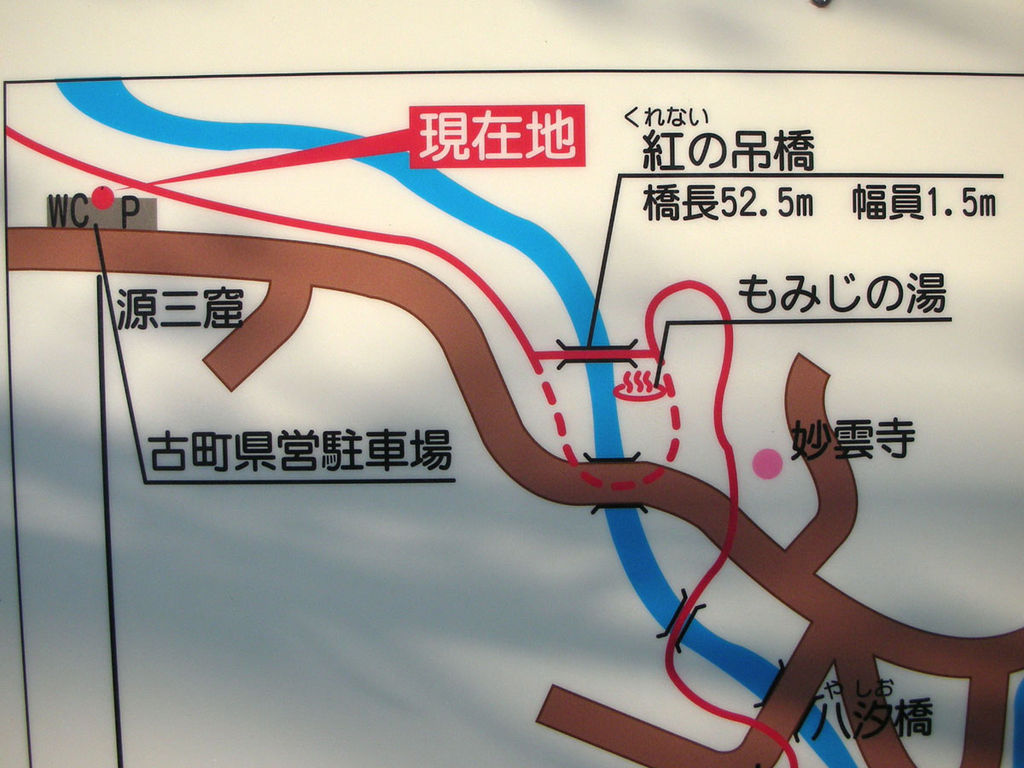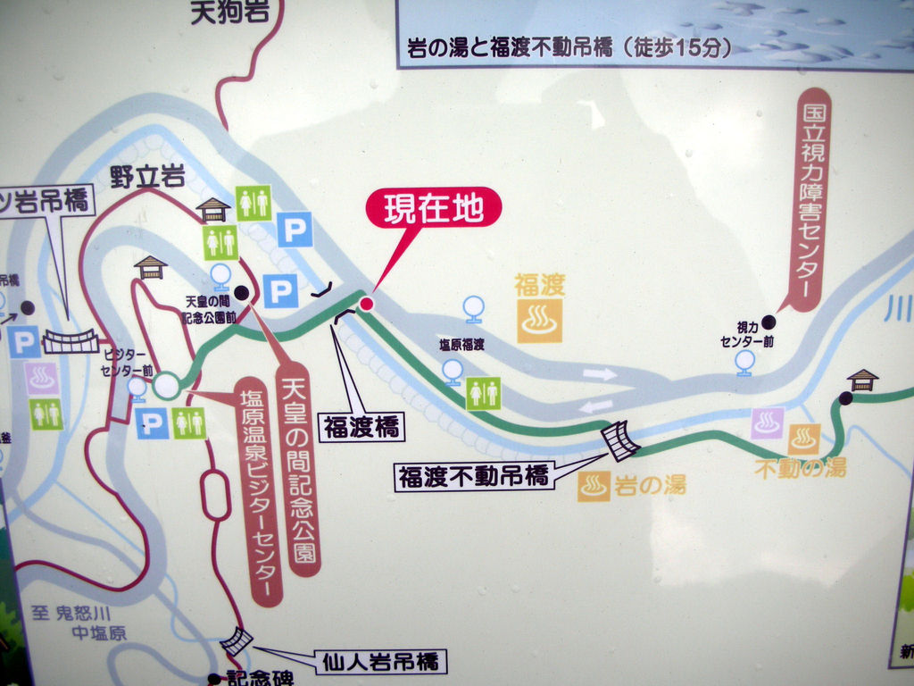 塩原バレーライン(国道400号線と北側で並行)沿いの古町県営駐車場に車を置き、箒側沿いの遊歩道を東に歩いていく。渓流釣りを楽しむ人たちを横目に歩くこと約1km、見晴台釣堀の色とりどりの幟旗が見えたらすぐそばに架かる紅の吊橋を渡る。橋のたもとにあるのが「もみじの湯」。