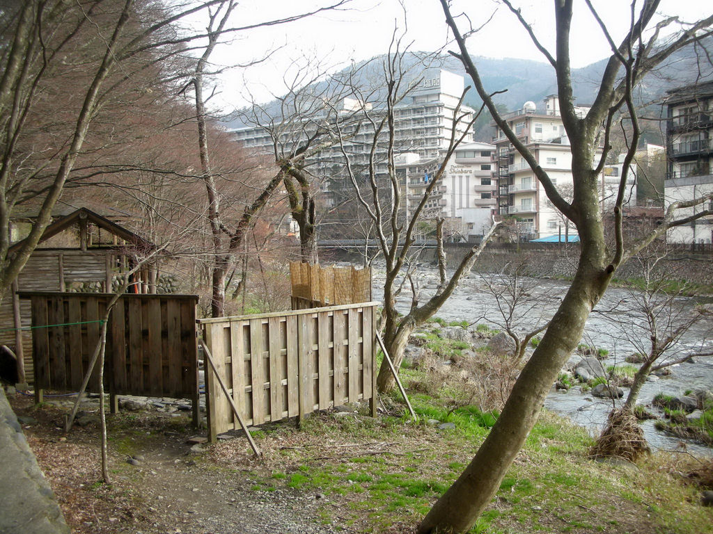 温泉街の規模や箒川を目の前にした開放的な立地ゆえ、露天風呂には簡易的な板塀が立ち、三方を囲っただけの脱衣所では布をカーテン代わりにすることもできる。湯船は小判型で3:2くらいの割合で仕切っている。無色透明の源泉はかなりの熱湯だが、仕切ることによって流れ込む湯量を制限しており、わりと温めだった。目の前を箒川が流れるが、川に面した板塀だけ低くし、その上にすだれを立てている。残念な気もするが、苦肉の策というべきか、もしかしたら管理者の抵抗か。大型ホテルを眺めながら入浴するのもおつな気分だ。ちなみに真正面に建つのは「塩原もの語り館」で、駐車場の利用は来館者のみ。