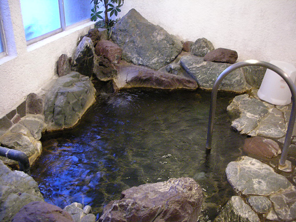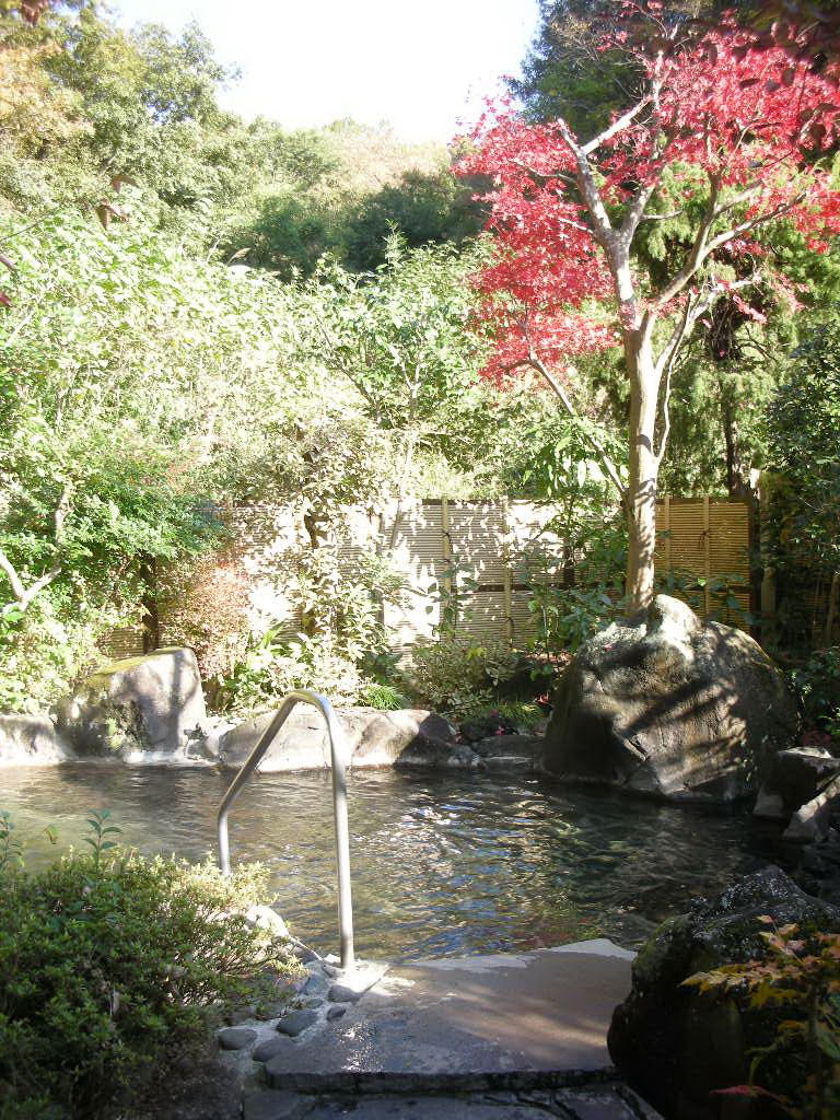 タイル張りの浴室は、室内の半分を湯船が占め、半分は洗い場兼露天風呂への通路。7つのカランが横一列に並んでいる。旅館の浴室としてはいたって普通。露天風呂のほうが風情があっていい。大きな石を積み上げ、高さ1mほどからお湯が流れ落ちてくる。湯船のまわりを植栽と竹垣風の塀が囲み、その向こうには雑木林が見える。欲を言えばもう少し塀を下げて開放感が欲しかったな、と。