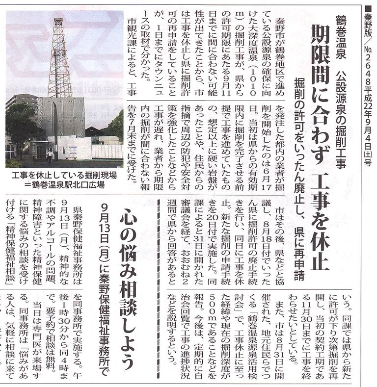 ・鶴巻温泉・公設源泉掘削に「待った」(10/01/15の記事)